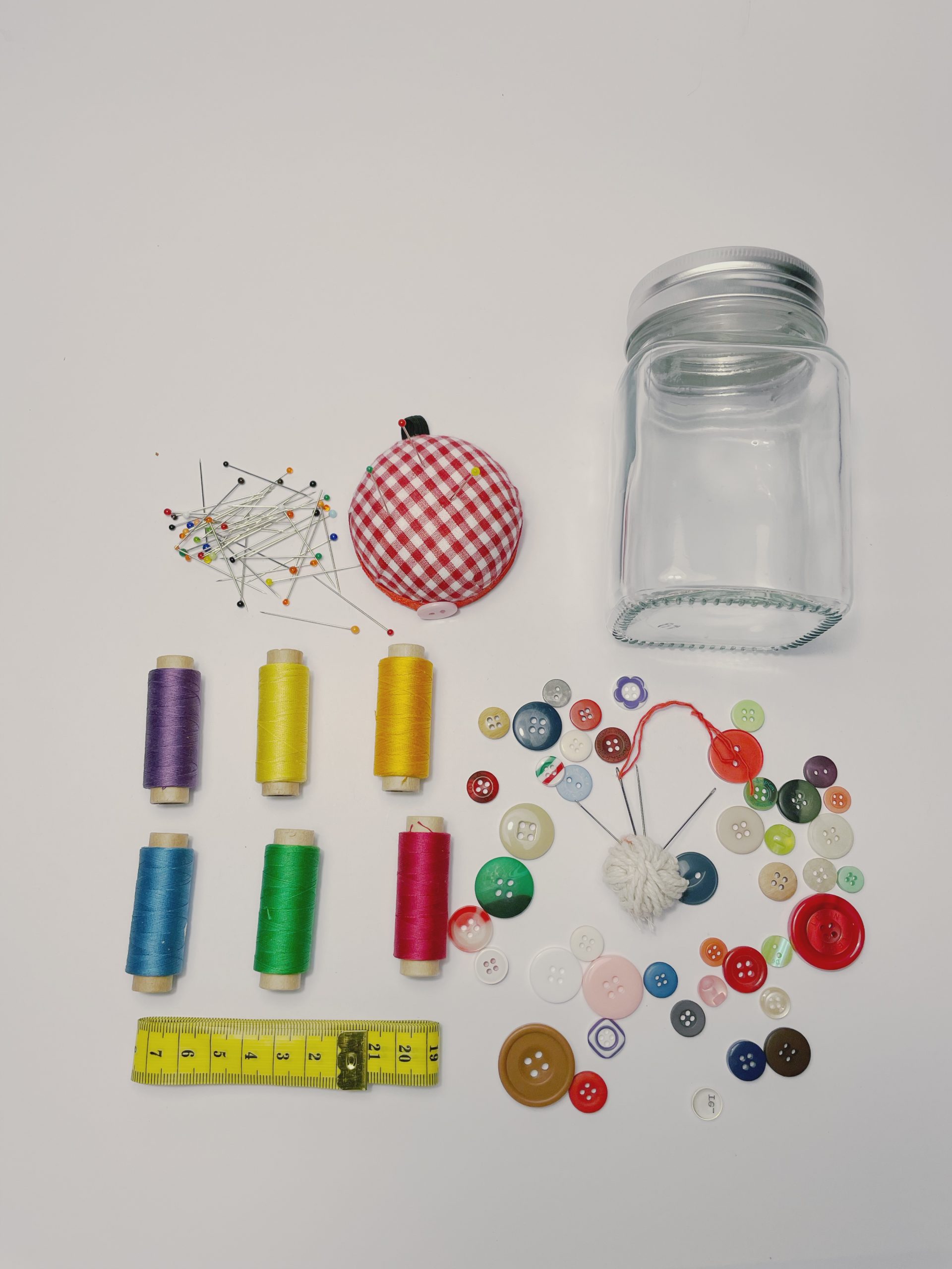 Тегла со конци, игли, копчиња, метро и перниче за игли.